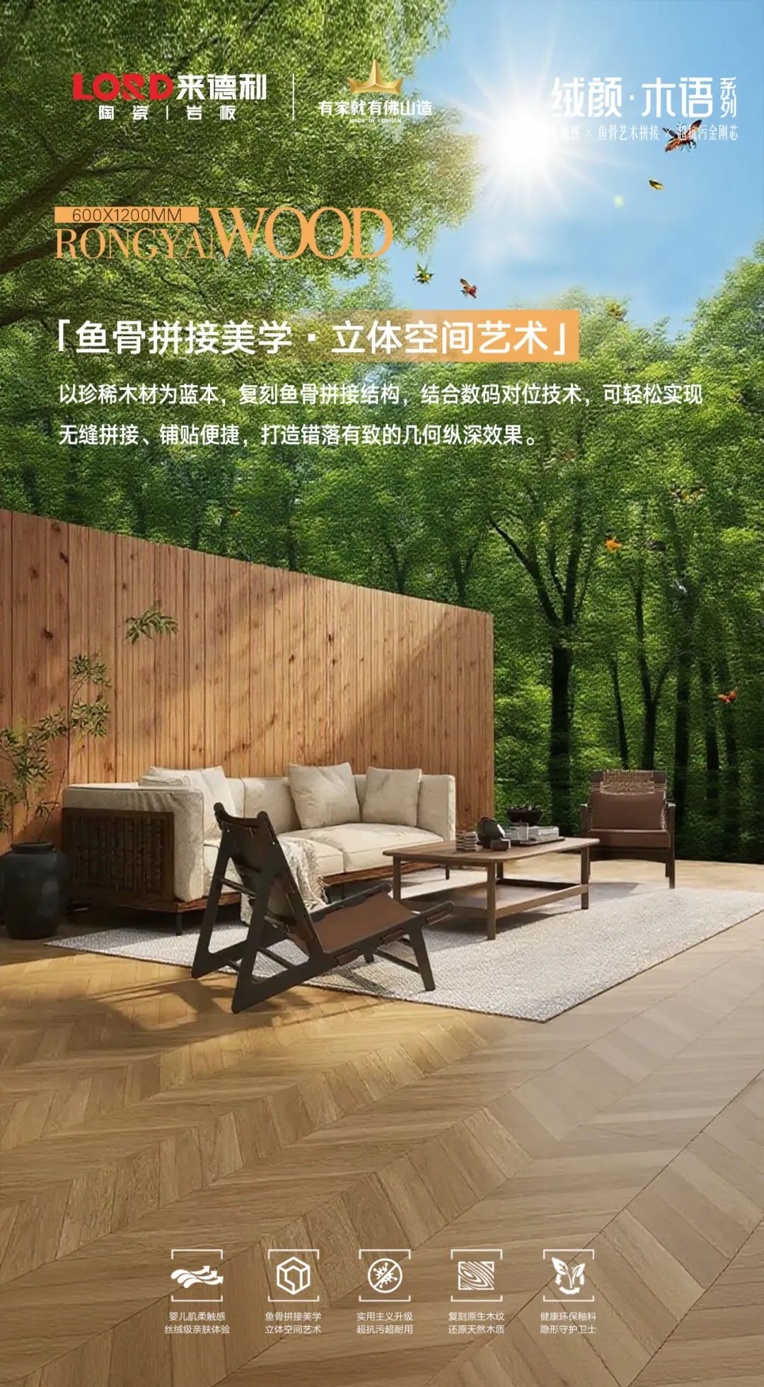 以珍稀木材为蓝本,复刻鱼骨拼接结构,结合数码对位技术,可轻松实现无缝拼接、铺贴便捷,打造错落有致的几何纵深效果。