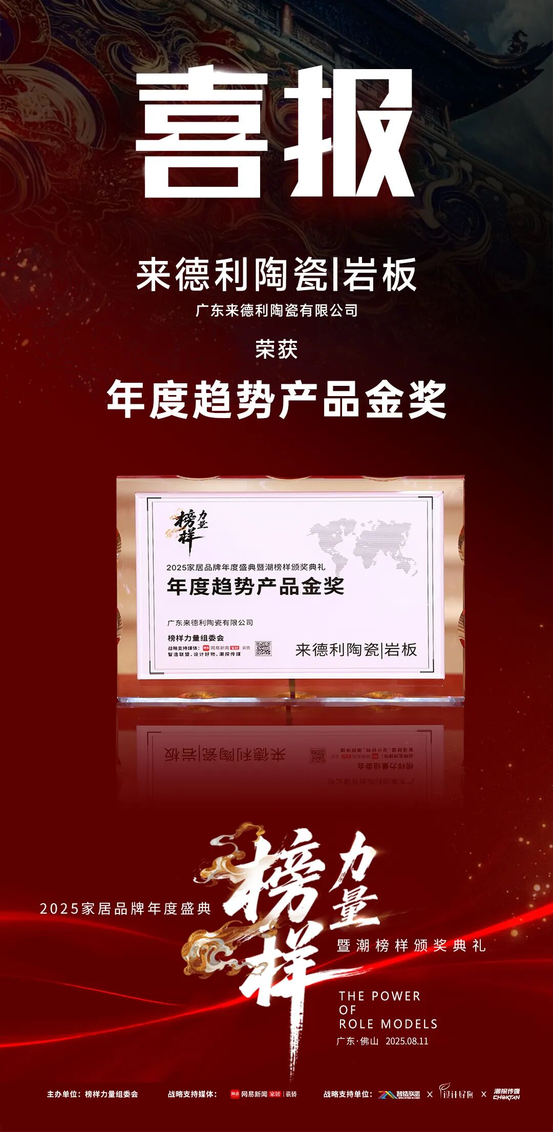 8月11日,以 “潮榜样” 为核心的 2025榜样力量年度家居品牌盛典暨颁奖典礼璀璨落幕。本届盛典旨在表彰以先锋之姿重塑产业格局、定义未来趋势的标杆品牌。活动现场汇聚各个家居领袖、设计大师及跨界精英,共同探讨家居行业的发展趋势。