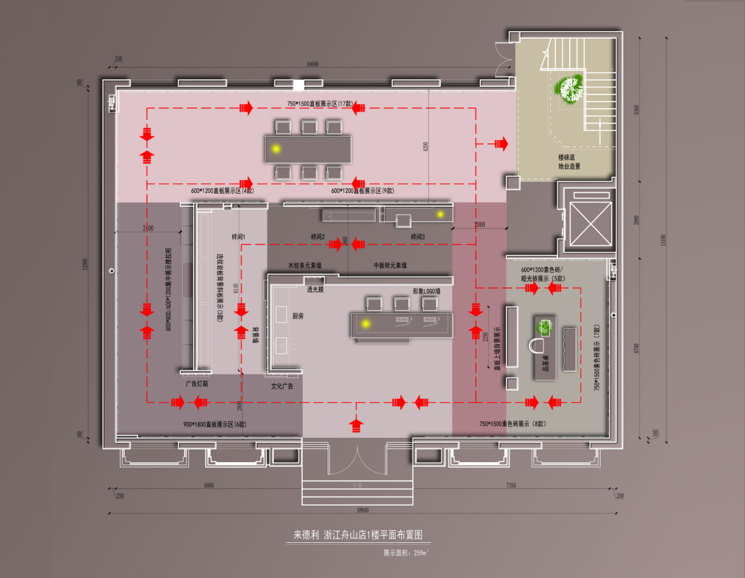 展示空间:形象接待区/选材区/品茶鉴赏区/模拟应用空间